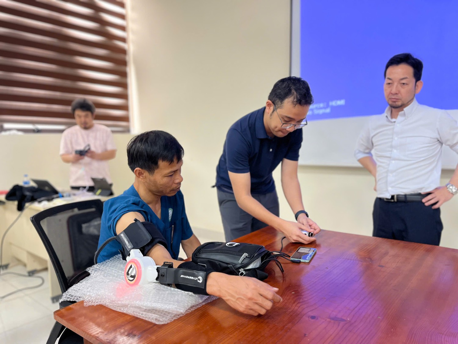 Sau phần thảo luận và tham luận sôi nổi từ các bác sĩ của bệnh viện, đoàn chuyên gia đã tiến hành trình diễn trực tiếp trên bệnh nhân đang điều trị tại Bệnh viện Phục hồi chức năng Trung ương. Hoạt động này giúp đội ngũ y bác sĩ tại chỗ tiếp cận thực tế quy trình vận hành và những ưu điểm vượt trội của thiết bị.