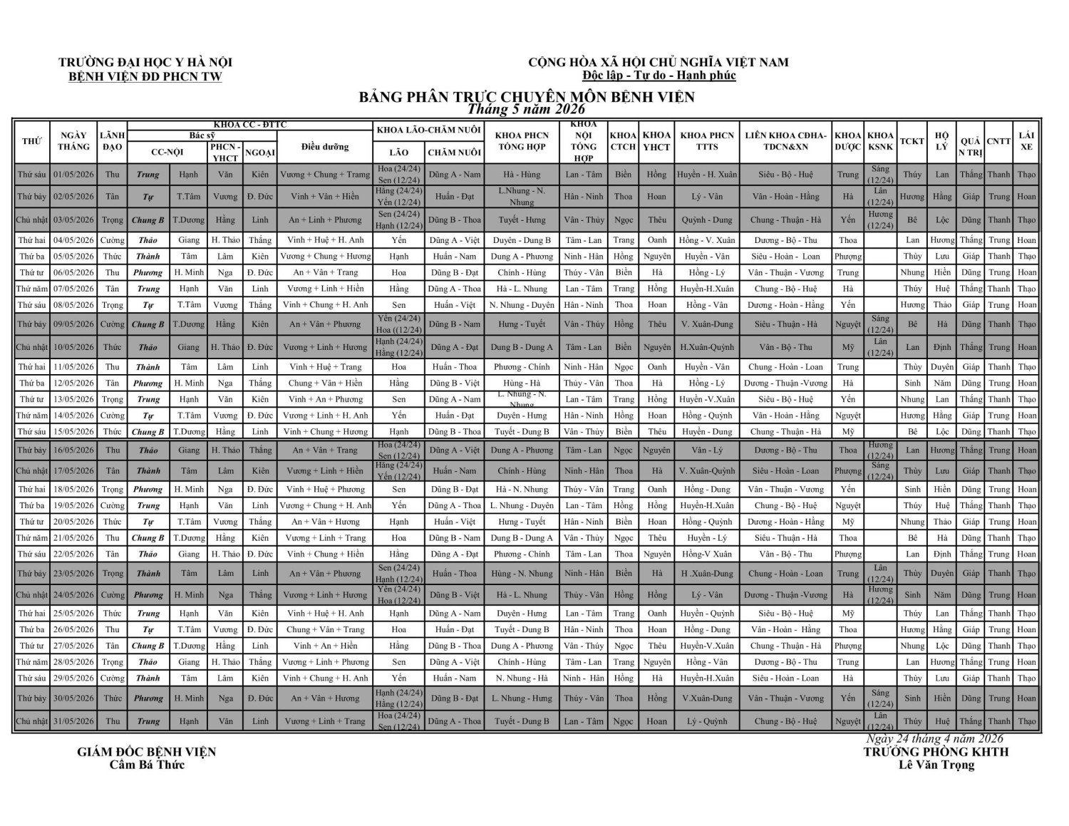 LỊCH TRỰC THÁNG 5/2026