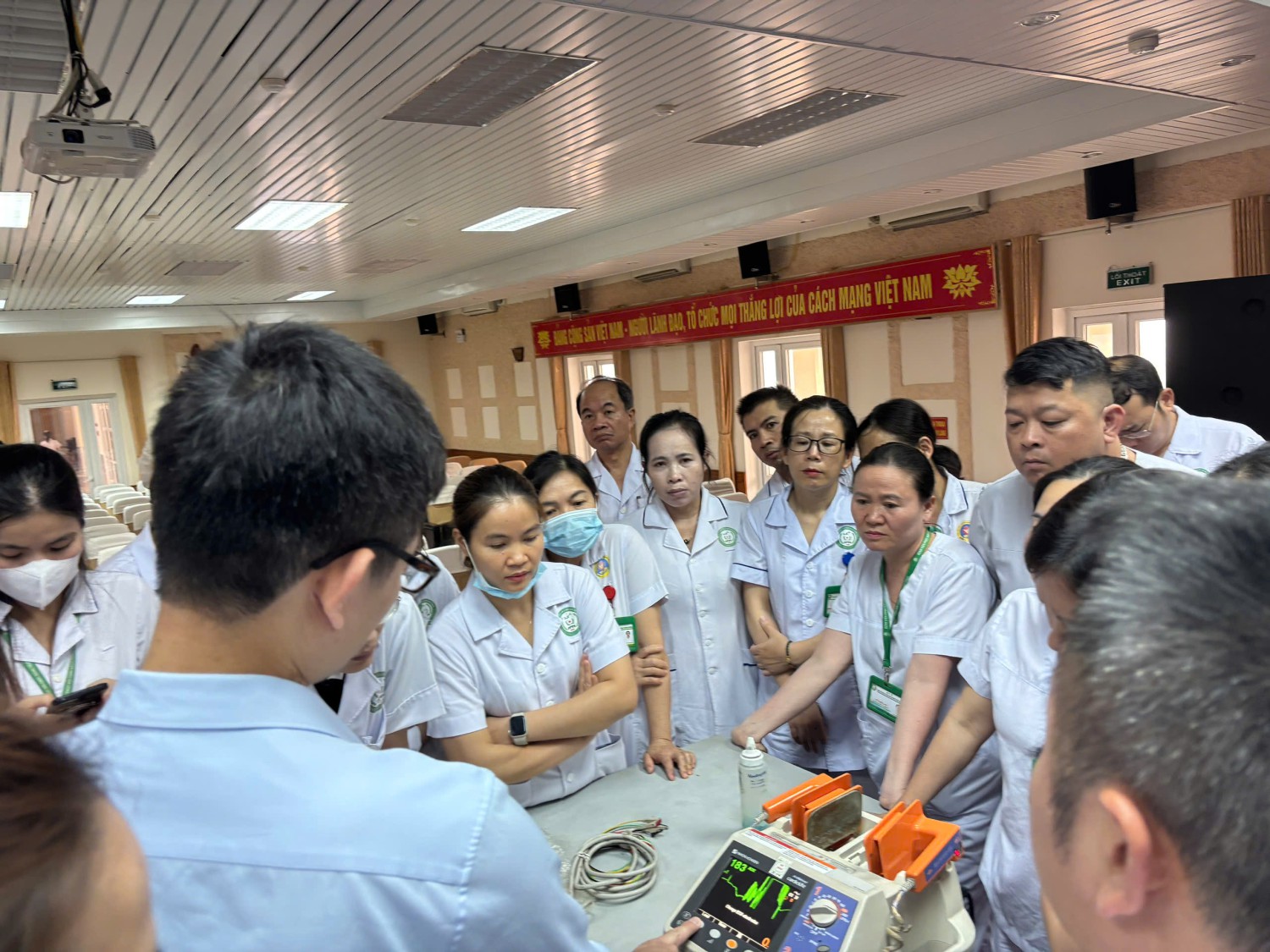 Trong khuôn khổ khóa đào tạo liên tục về Cấp cứu, các học viên của khóa học đã có buổi học thực hành chuyên sâu về kỹ năng sử dụng máy sốc điện. Đây là một trong những nội dung quan trọng nhất, quyết định khả năng cứu sống bệnh nhân trong các tình huống ngừng tuần hoàn do rối loạn nhịp tim nguy hiểm.