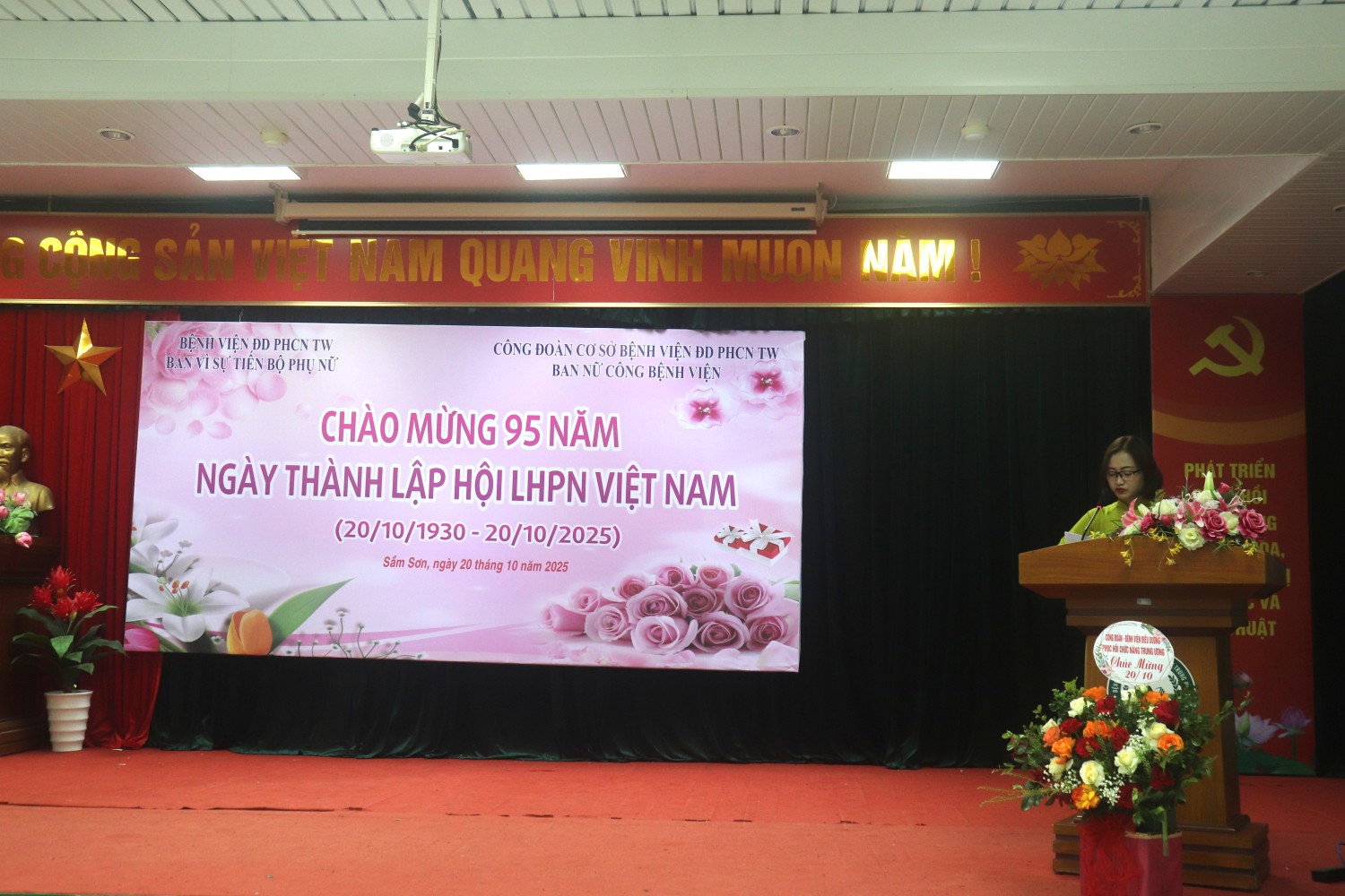 Thay mặt Ban Nữ công Bệnh viện, Bà Trần Thị Hà – Trưởng ban Nữ công đã có bài phát biểu khai mạc, ôn lại truyền thống 95 năm lịch sử hào hùng của Hội Liên hiệp Phụ nữ Việt Nam. Bài phát biểu nhấn mạnh vai trò không thể thiếu của phụ nữ trong sự nghiệp xây dựng và bảo vệ Tổ quốc, đặc biệt là những đóng góp thầm lặng, tận tụy của các nữ cán bộ, nhân viên y tế Bệnh viện trong công tác chăm sóc sức khỏe người bệnh.